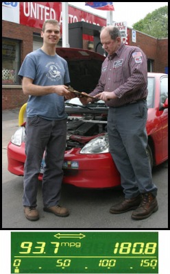 Check-in was relatively easy at a service station in Waterbury. They checked our tire pressure and filled the tank up. One of the attendants was amazed that it only took 2.5 gallons and asked "Where did you come from?". We'd covered close to 200 miles and crossed two states to burn those 2.5 gallons. After a photo, we were off. The drive was tense and relatively slow. We finished with 93.7 mpg. This will account for 30% of our score so we're off to a good start. Note: we're in the "Stock Honda Insight Manual Transmission" class. This is in a 5 year old car that has not been modified at all. It's a small two seat hatchback that anyone could own. Another driver named, "Xcel", came out from Iowa and beat us at 96 mpg. Search for his name on greenhybrid.com or insightcentral.net. (He has the highest posted gas mileages - usually near 100 mpg.) (Posted 5/13/2006 by admin) |